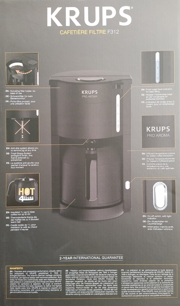 schwenkbarer Filtereinsatz, Antitropf-System, Thermokanne, außenliegende Wasserstandsanzeige, An-/Ausschalter mit Kontrollleuchte, Warmhalteplatte bis 4 Std.